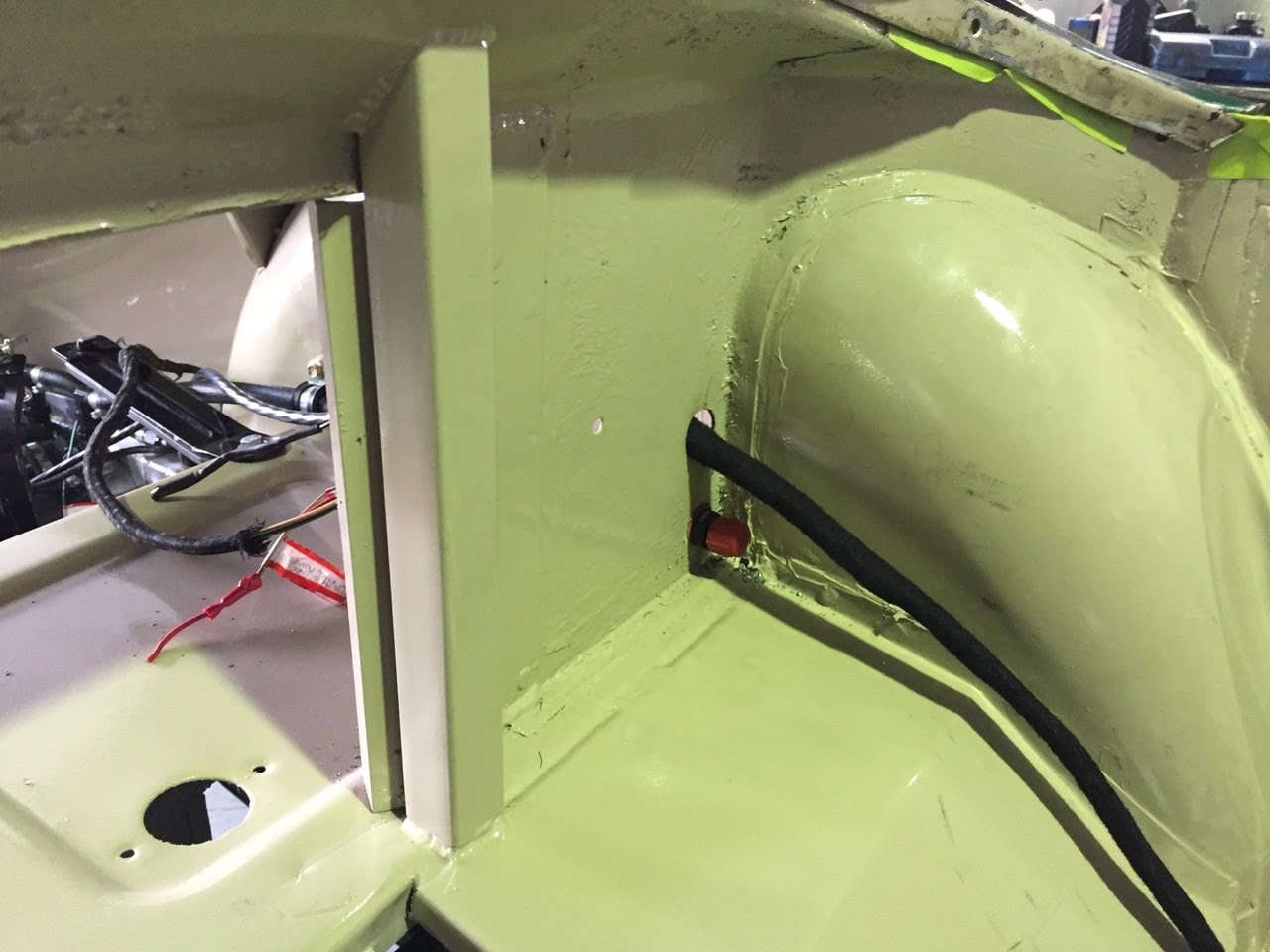 As the rear fuel pump mounting came together, the fuel line was located up to the rear fire wall and into the cabin. Once in the cabin, a steel line will be run through the cabin to the front fire wall before it returns to flex line which will run to the carbs. But at no point will the fuel line travel underneath the car where it could be exposed to potential damage. The same is true with the electrical wires - The main part of the wiring (fuse boxes etc) have all been moved inside the cabin, high up on the firewall, in order to protect them from engine heat and water ingress during river crossings. The wires to the back of the car then follow the fuel line on the pax side of the car, up into the boot for the fuel